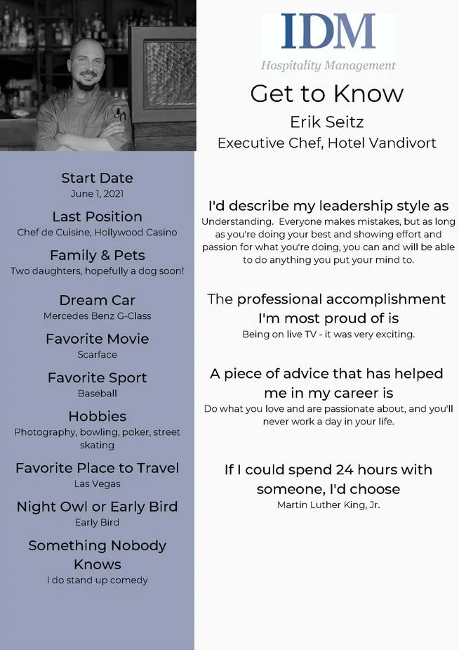 Jamie Rady August 6, 2021 Jamie Rady August 6, 2021 IDM Hospitality is excited to welcome Erik Seitz, Executive Chef at Hotel Vandivort as part of our continued quest to elevate the hospitality experience.Learn more about Erik below: